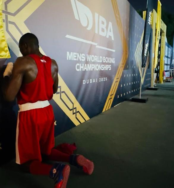 Robert Okaka goes down in prayer after winning his Round of 16 clash against Tunisia’s Youssef Rafrafi at the IBA Men’s World Boxing Championships at the Dubai Duty Free Tennis Stadium on Monday. PHOTO – ELIAS MAKORI.